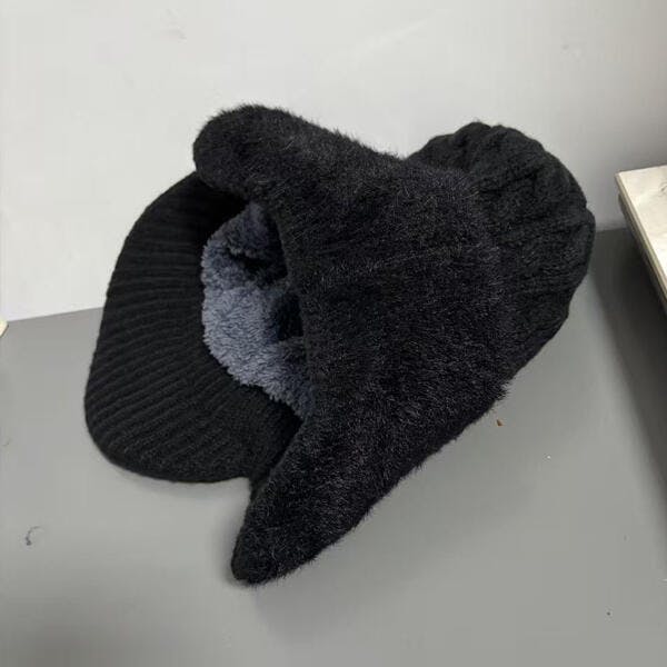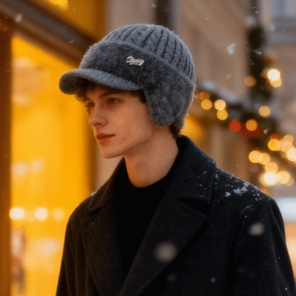 Integrovaný zimní design: pletená čepice + kšilt + ochrana uší v jednom